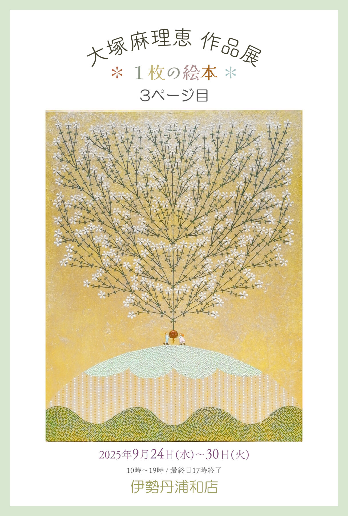 伊勢丹浦和店では3度目となる大塚麻理恵氏の個展です。物語の一部のような詞書を添えて展示される大塚氏の作品は、まるで『1枚の絵本』のようです。新点描主義に基づき描かれる大塚氏の作品は、時にユーモラスに、時にほのぼのと描かれます。今回は、近年人気の「お花」を描いたシリーズも登場。飾りやすい小さめの絵画もございます。キラキラと輝く絵肌、ポツポツとでっぱりのある絵肌は飾ってみると存在感たっぷり。ぜひ会場でお楽しみください。