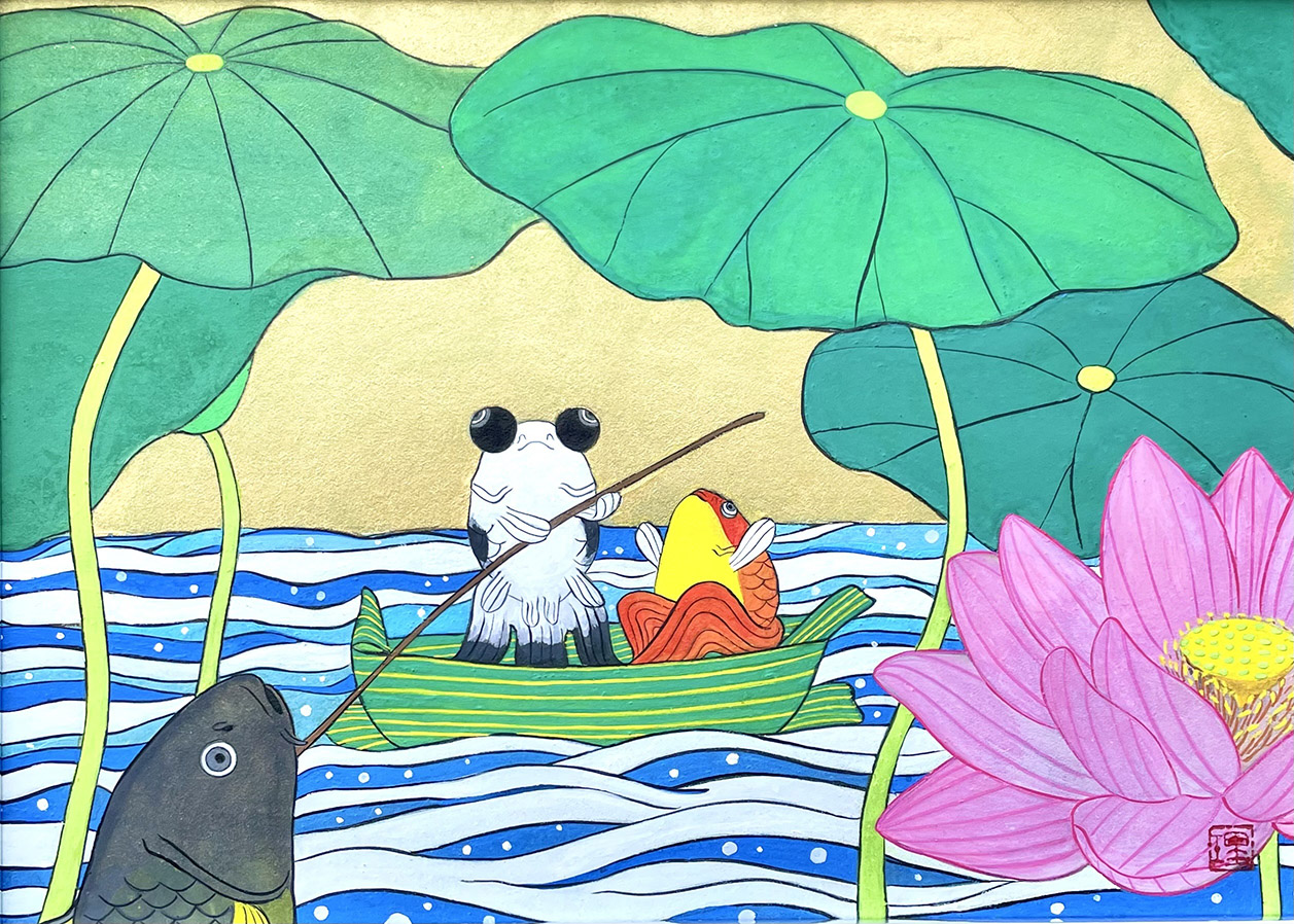 美術大学の受験デッサンで目の前にあるものを写実的に描くことを続けてきた斎藤理絵は、現実にあるものを描くことから、脳内に湧いてくるイメージを多く描くようになりました。登場するのは、河童や人魚など妖怪に近い存在から龍や鳳凰といった神様に近い存在まで多様です。しかし、そこで描かれた者たちに恐ろしさやおどろおどろしさはなく、おかしみのある表情をしています。斎藤理絵の絵の中で人間のように振る舞う鯉や金魚は、鳥獣戯画や歌川国芳の浮世絵などに通じる遊び心があります。絵は、言葉遊びや駄洒落のようなタイトルになることもあり、その意外性ある取り合わせに思わず顔がゆるみます。また、日本や中国に伝わる縁起や幸運、長寿を意識した作品も多く、楽しさと共に絵を買われた方々の幸せを祈る気持ちがお客さまの心をとらえています。
