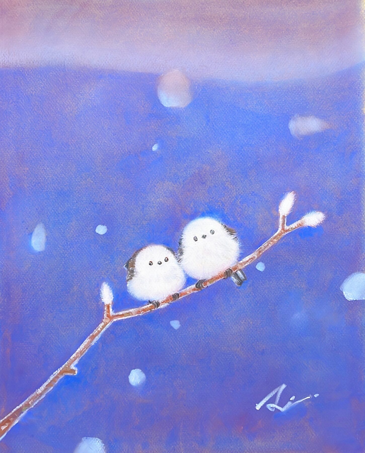 Yahooニュースでは「シマエナガの画家」として紹介され、展覧会場には多くのお客様が来場され、初日から作品がわずかとなりました。白くふわふわしたシマエナガは、パステルの画材のもつ柔らかな質感によって愛らしさを増し、そのつぶらな小さな瞳が見る人の心をとらえます。