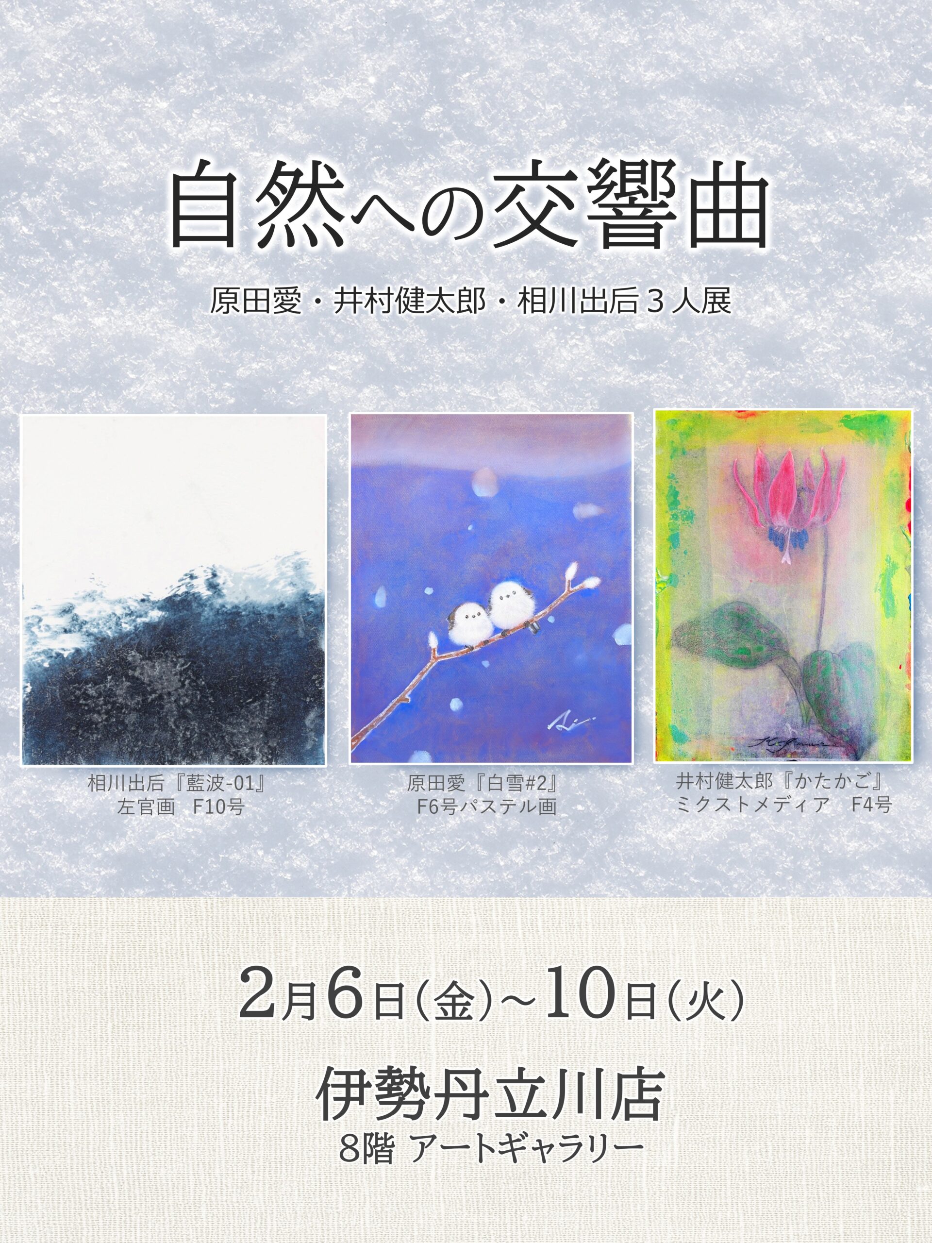 ふかふかふわふわの動物たちを描き、近年はシマエナガの画家として広く知られる原田愛。変化する自然の様相を、夢幻の世界に変容させる独自の色彩感覚で表現する井村健太郎。左官職人の経験を活かし、漆喰と藍の息遣いを感じつつ自然を想起させる作品へと昇華する相川出后。自然の発するささやきを、異なる技法で表現する3人のアーティストの競演をお楽しみください。