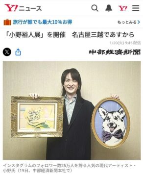 名古屋栄三越で個展を開催する小野裕人さんのニュースが、Yahooニュースに掲載されました!(中部経済新聞掲載記事より。2026年1月20日掲載)Yahooニュースで紹介される画家の小野裕人さん(中部経済新聞掲載記事より。2026年1月20日...